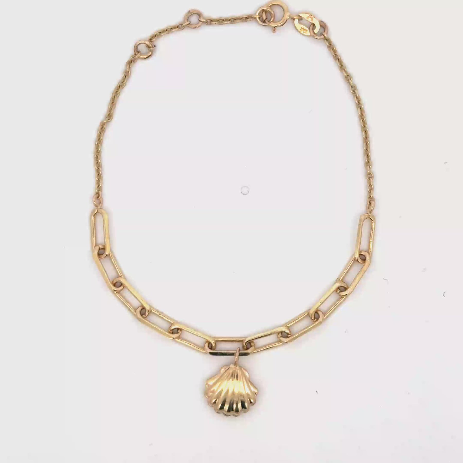 An elegant yellow gold charm bracelet featuring a sophisticated link chain design. The piece showcases a small shell dangling charm with a high-polish finish, creating a luminous and rhythmic arrangement.